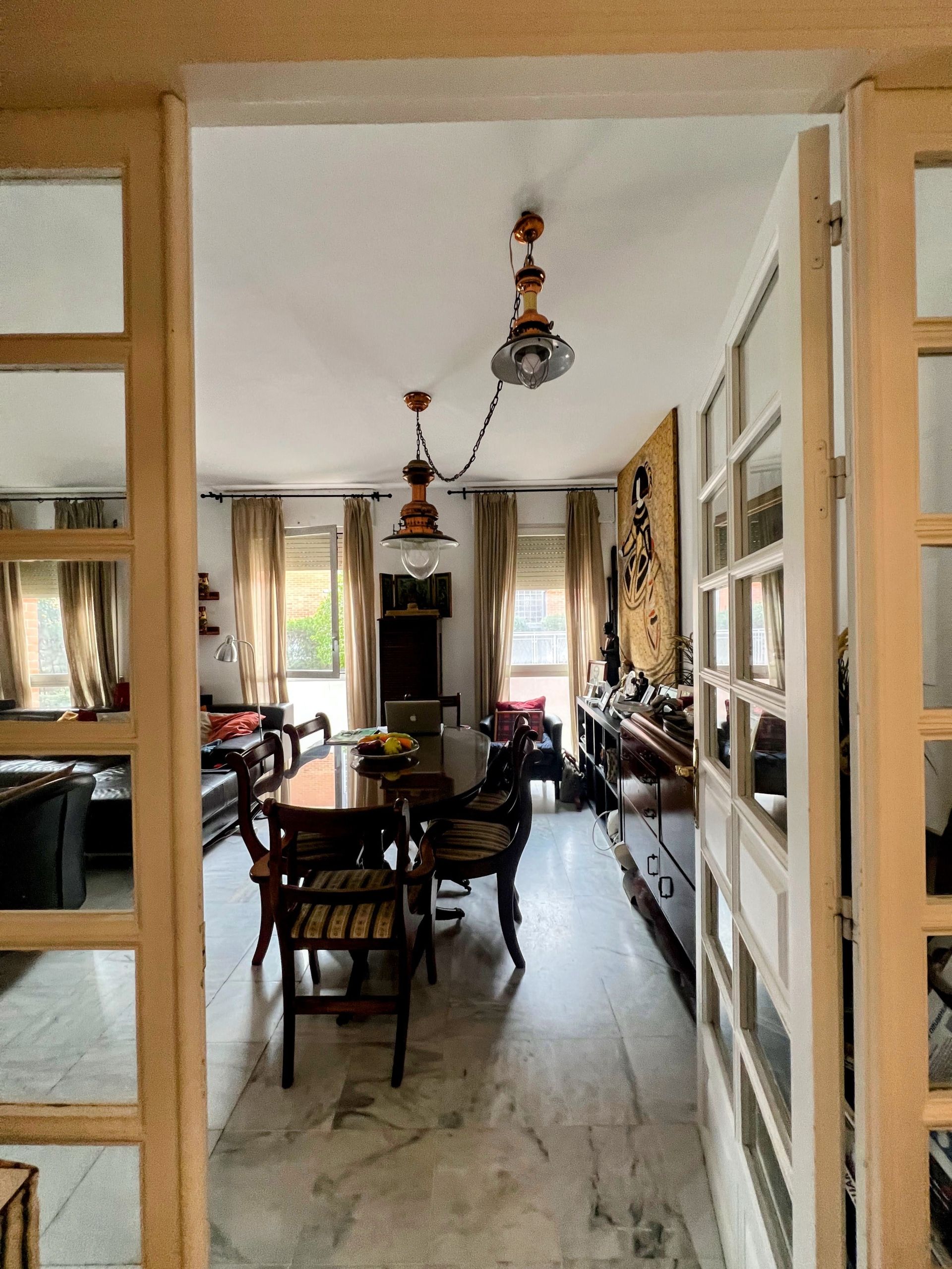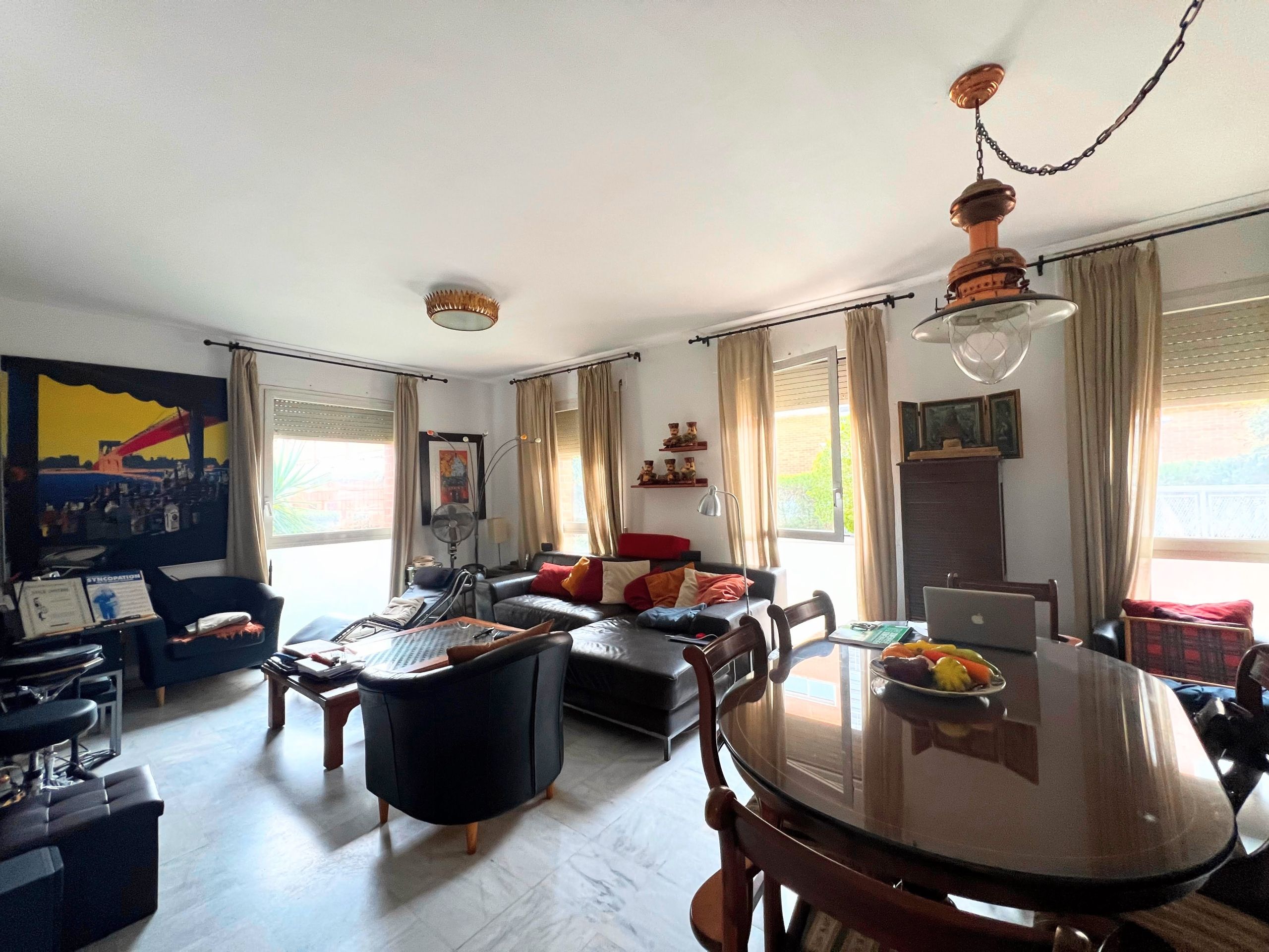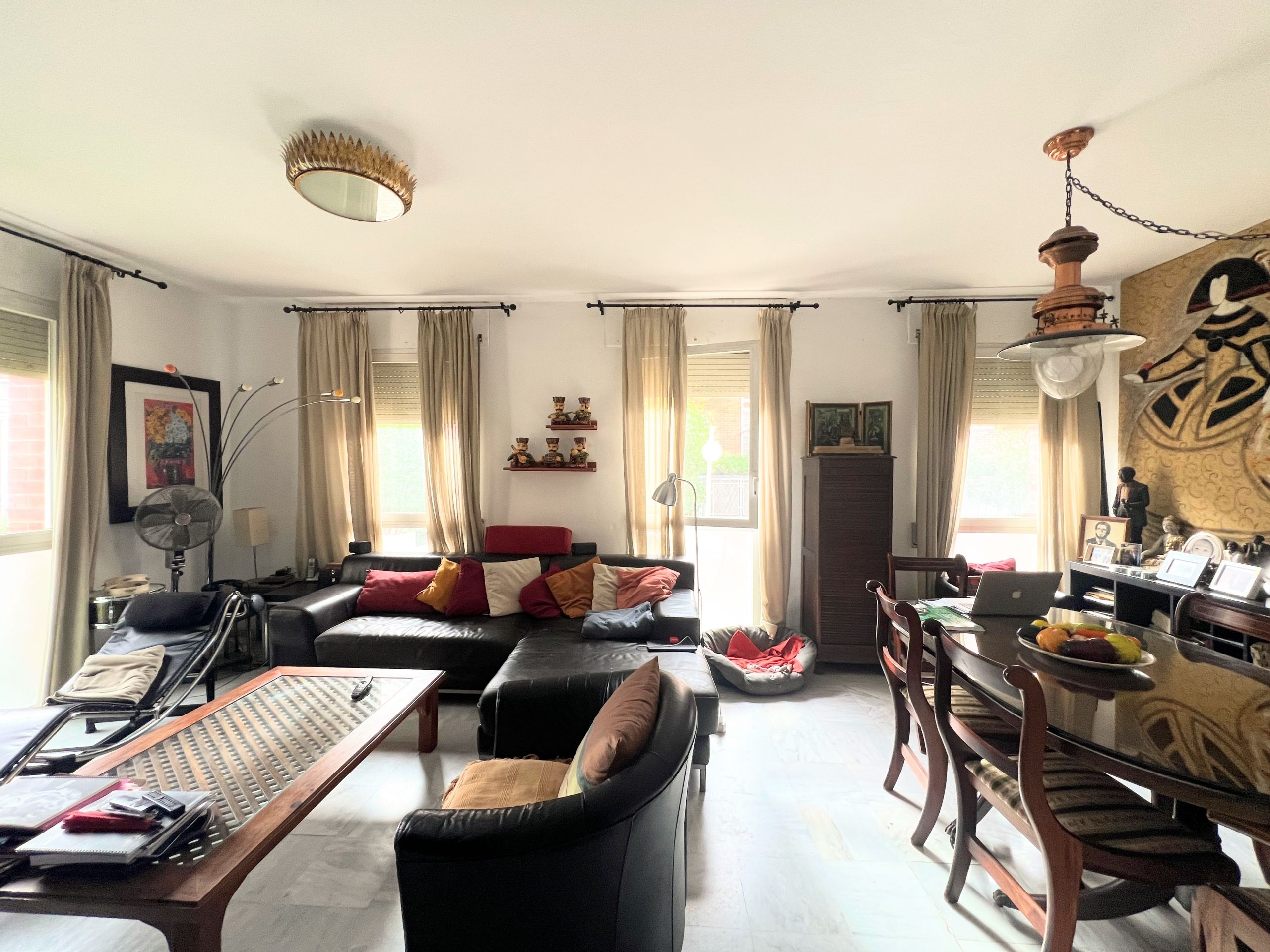 Piso en planta baja, ( por su altura podria considerarse una entreplanta ) con muchísima luz gracias a su orientación sur este y los cuatro ventanales del salón. Con tres habitaciones y dos baños, pasillo distribuidor ancho, garaje de buen tamaño y trastero.
